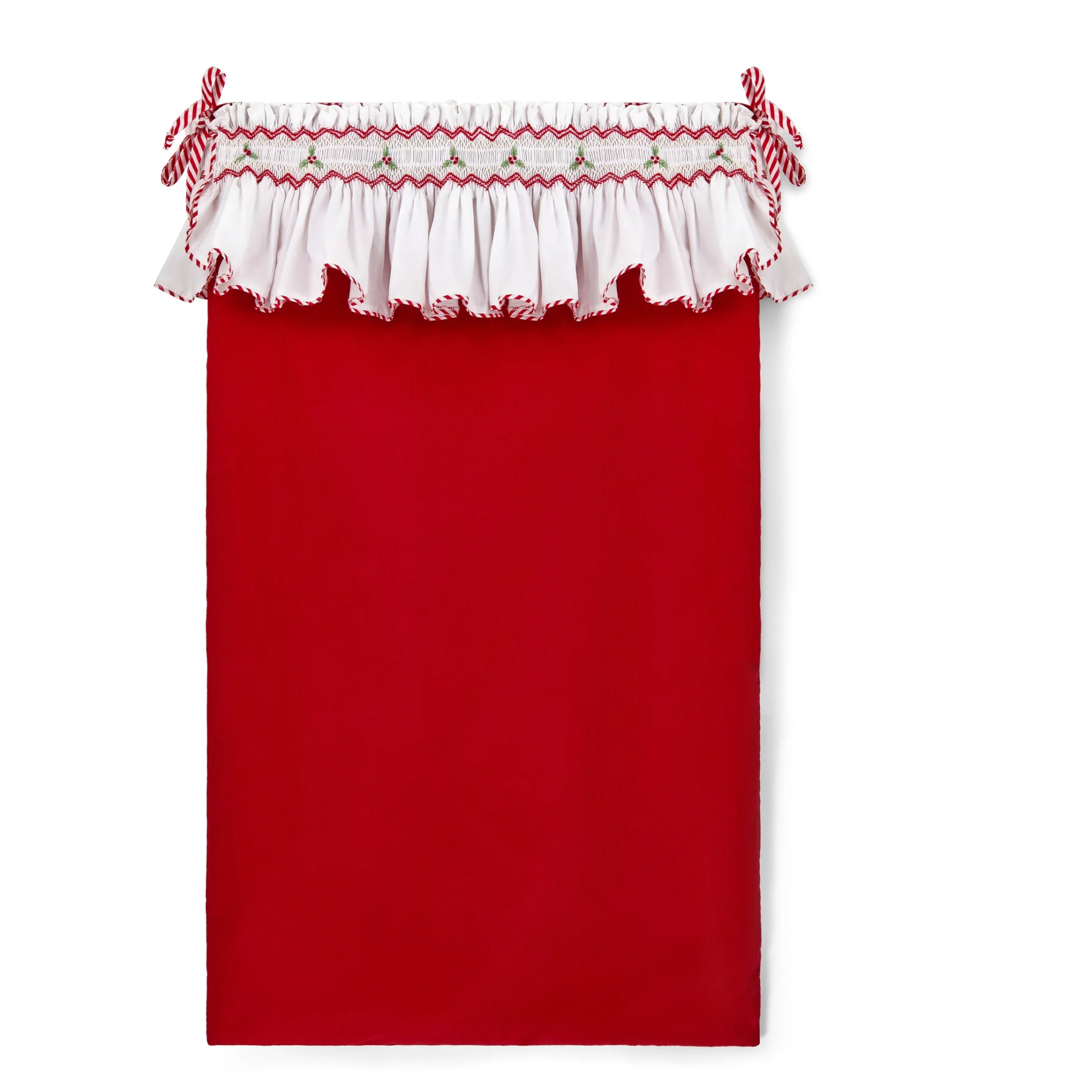Our 'Smockings' and 'Smocked Sacks' are available in 5 designs (2 new designs for this season!) This listing is for our Smocked Sack in Holly with white frill, candy cane string, Holly motif smocking and a crimson needlecord main body.