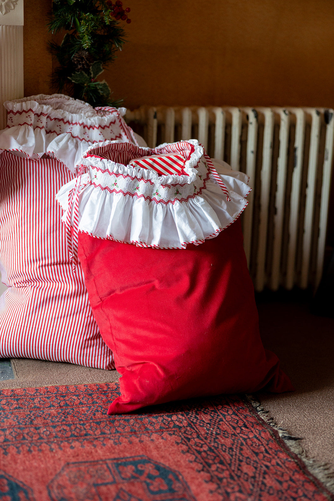 The art of hand-smocking is so wonderfully nostalgic and timeless that it lends itself perfectly to heirloom pieces. And nothing feels quite so evocatively nostalgic as the tradition of hanging Christmas stockings and laying out festive sacks on Christmas Eve. The giddy excitement at the prospect of a visit from Father Christmas and the goodies that will fill the stocking/sack come Christmas morning.
