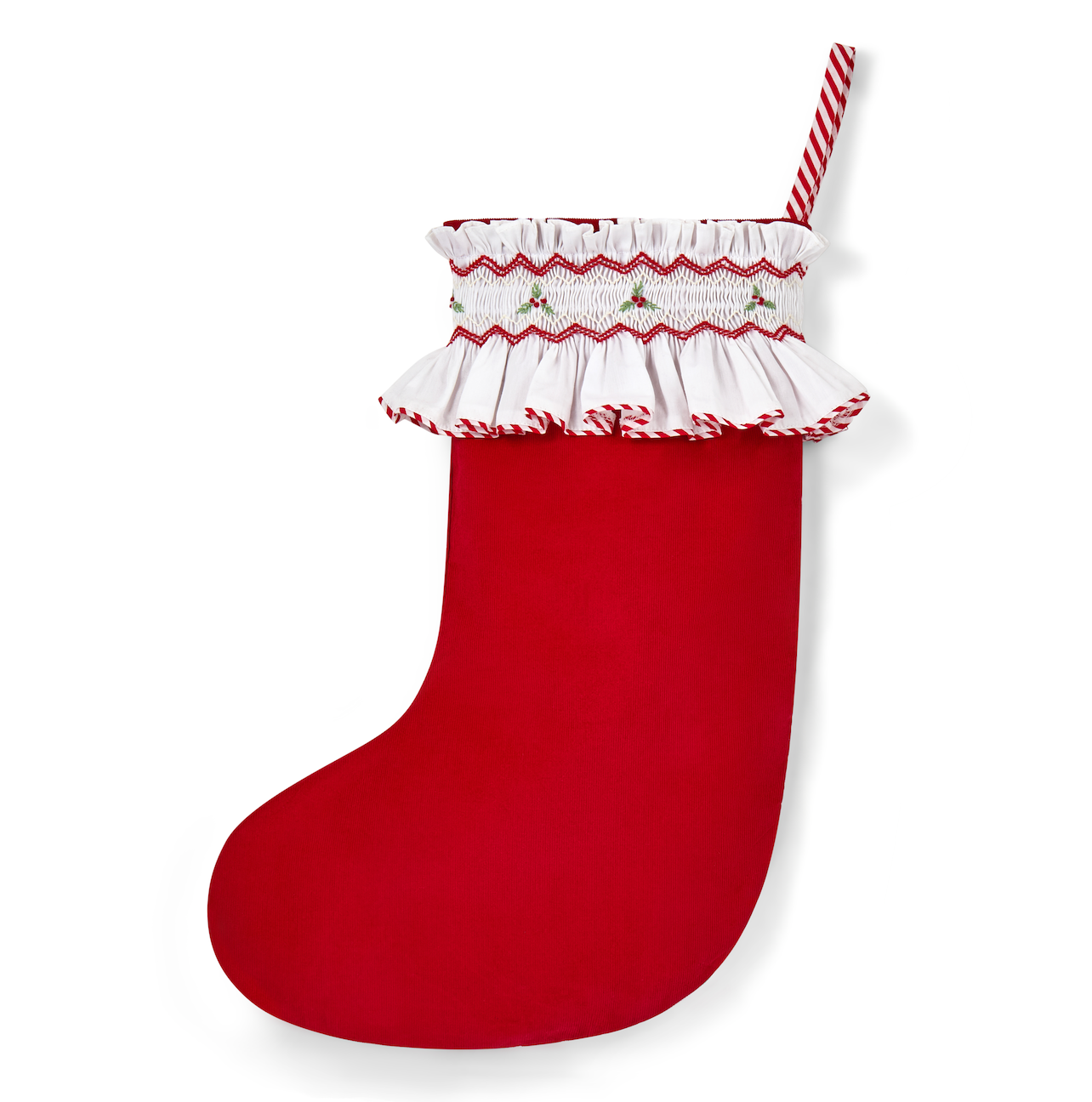 Our 'Smockings' and 'Smocked Sacks' are available in 5 designs (2 new designs for this season!). This listing is for our new 'Holly' stocking with white smocked frill featuring Holly motifs, Crimson needlecord main body and candy cane string, as pictured.